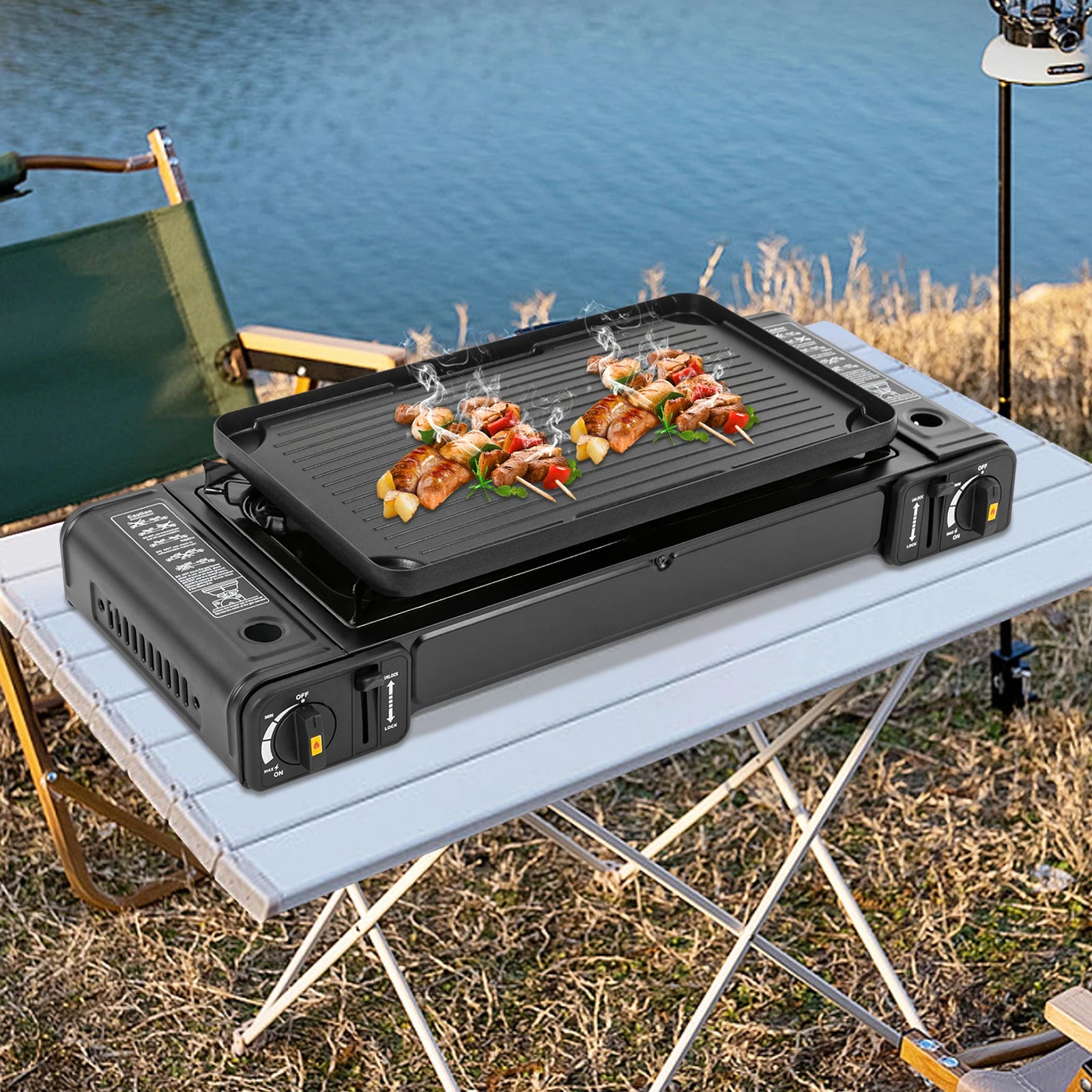 🍢Camping Stove Dual Burner Butane Powered W/43.5*25CM Grill Tray & 66*28CM Storage Case Portable Outdoor Cooking Gear for Picnic BBQ Hiking