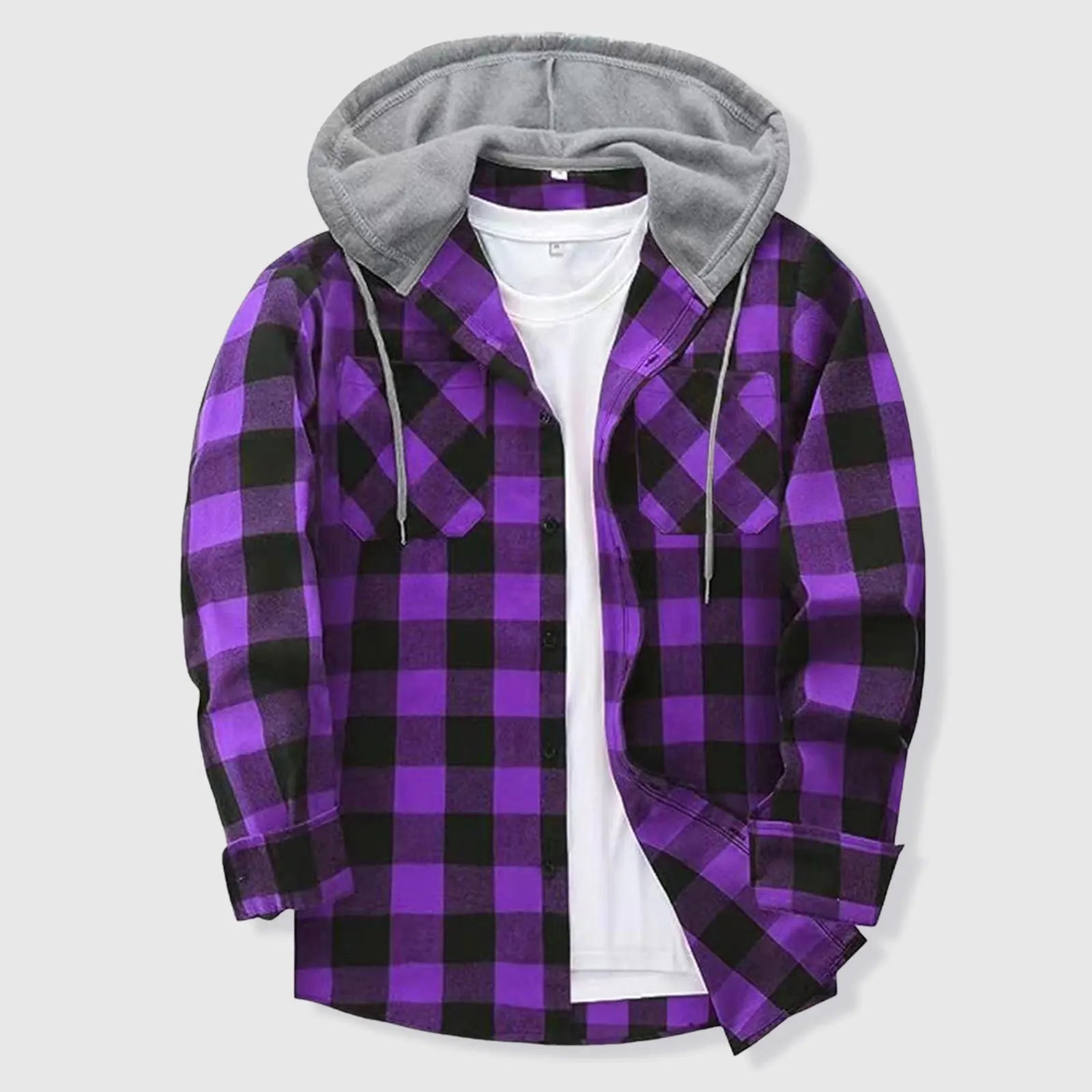 Men's Button Plaid Hooded Casual Shirt with Double Pockets and Drawstring